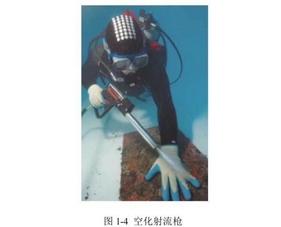空化射流沖洗技術使用的設備為空化射流噴槍,如圖1-4所示為空化射流清洗設備的輸出端,其形狀類似于手槍,由于其尺寸小、體積較輕,所以潛水員在進行水下海生物清理作業時使用起來比較輕巧。由于空化泡潰滅時產生的微射流沖擊力非常短暫,而水的阻力和粘度又遠大于空氣,所以空化射流在淹沒環境下工作時,能量利用率比較低,有一部分微射流的能量會被海水吸收。