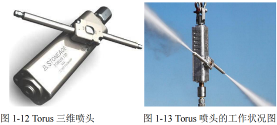 如圖1-12為該公司研發的Torus高壓水射流噴頭,該噴頭可以在空間內進行三維旋轉,其旋轉的動力來源于水射流接觸到待清理表面后產生的反作用力,噴頭的自轉由水射流的反作用力直接驅動,而噴頭的公轉是通過斜齒輪組從噴頭的自轉中獲取的一部分動力實現的,而且通過調節軸芯的位置可以實現對噴頭的無級調速。該高壓水射流噴頭專門用于儲罐以及大直徑管道內部的清洗,其最大工作壓力為150MPa,最大工作流量為300L/min。如圖1-13所示為Torus噴頭的工作狀況圖。