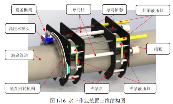 2016年,北京化工大學的碩士研究生劉霄亮在參考國外相關先進設備的基礎上,通過實驗驗證了淹沒環境下利用高壓水射流破碎混凝土的可行性,并通過仿真軟件研究了入口壓力、噴嘴形狀、噴嘴直徑等參數對淹沒環境下高壓水射流清除效果的影響,最終結合實際需求設計出了一套用于海底管道配重混凝土層清除的高壓水射流設備。這是國內首套將高壓水射流技術應用于水下混凝土破碎及清除的設備,該設備由高壓水射流系統和水下作業裝置兩部分組成,如圖1-16所示為該系統水下作業裝置的三維結構圖。