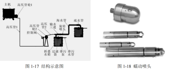 隨后設計研發出了一套用于船舶海水管線內壁污垢和海生物清理的高壓水射流清洗設備,該設備可以利用水射流產生的反作用力驅動蠕動噴嘴實現其在清理過程中同步向前推進,具有清理效率高、節能環保等優點,如圖1-17、1-18所示分別為該清理系統的結構示意圖和蠕動噴頭。