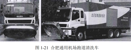 如圖1-21所示為該研究院研發的用于機場跑道除膠的高壓水射流清洗裝置,該裝置也是車載式的,所用的卡車經過特殊改裝,能以10m/min左右的速度勻速前進以配合清洗裝置作業,卡車上安裝的蓄水箱可供清理裝置連續作業一小時,該清洗裝置的單次清洗寬度可達2m,可以高效的完成飛機跑道除膠、停機坪油污清洗等工作。
